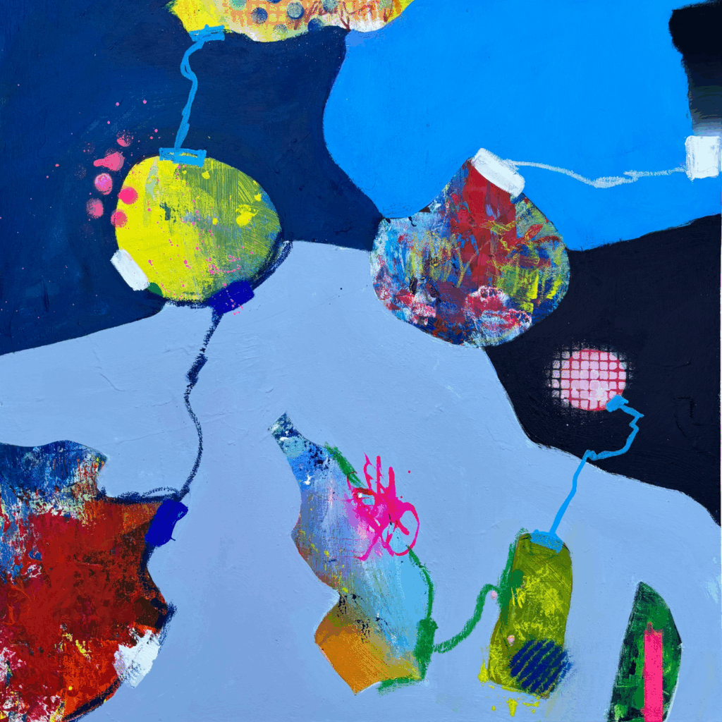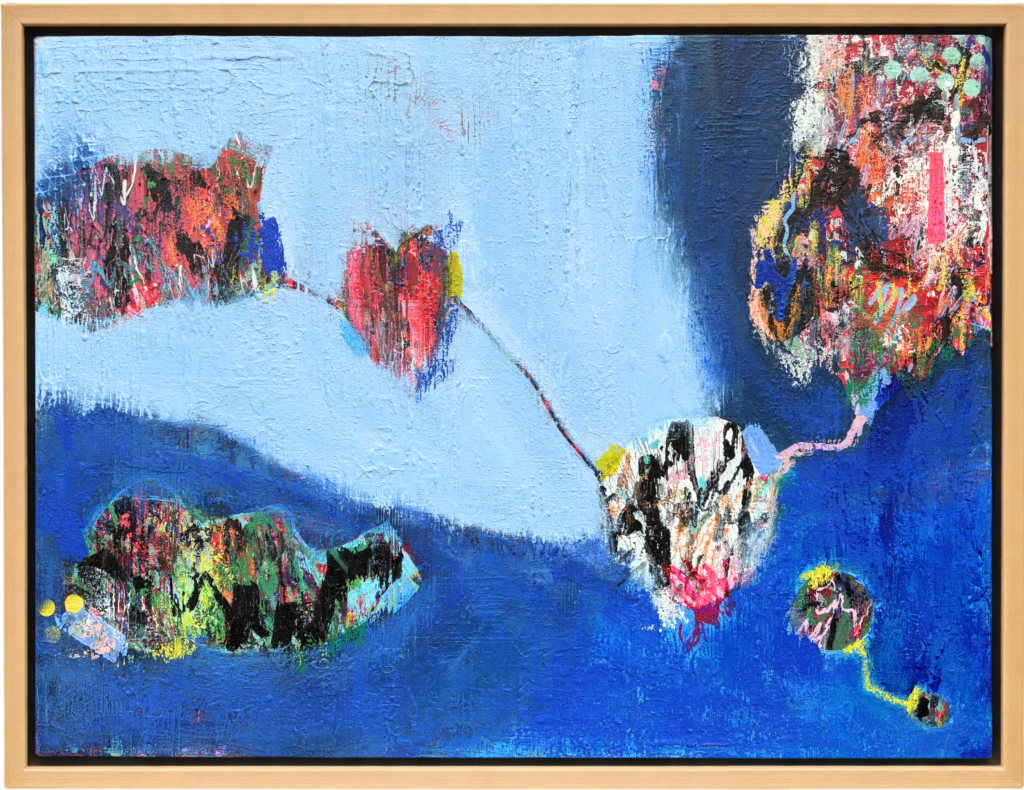 Dans ce jardin bleu, chaque toile est une parcelle de monde recomposé, où les éléments flottent librement, comme détachés de toute gravité. La composition devient respiration, et la peinture, un lieu d’enracinement imaginaire. C’est un jardin sans contour, à la fois refuge et dérive, nourri d’organique et d’onirique.